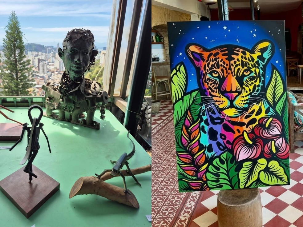 Da esquerda para direita: esculturas feitas por Pedro Grapiúna e quadro pintado por Rafa Mon — Foto: Reprodução