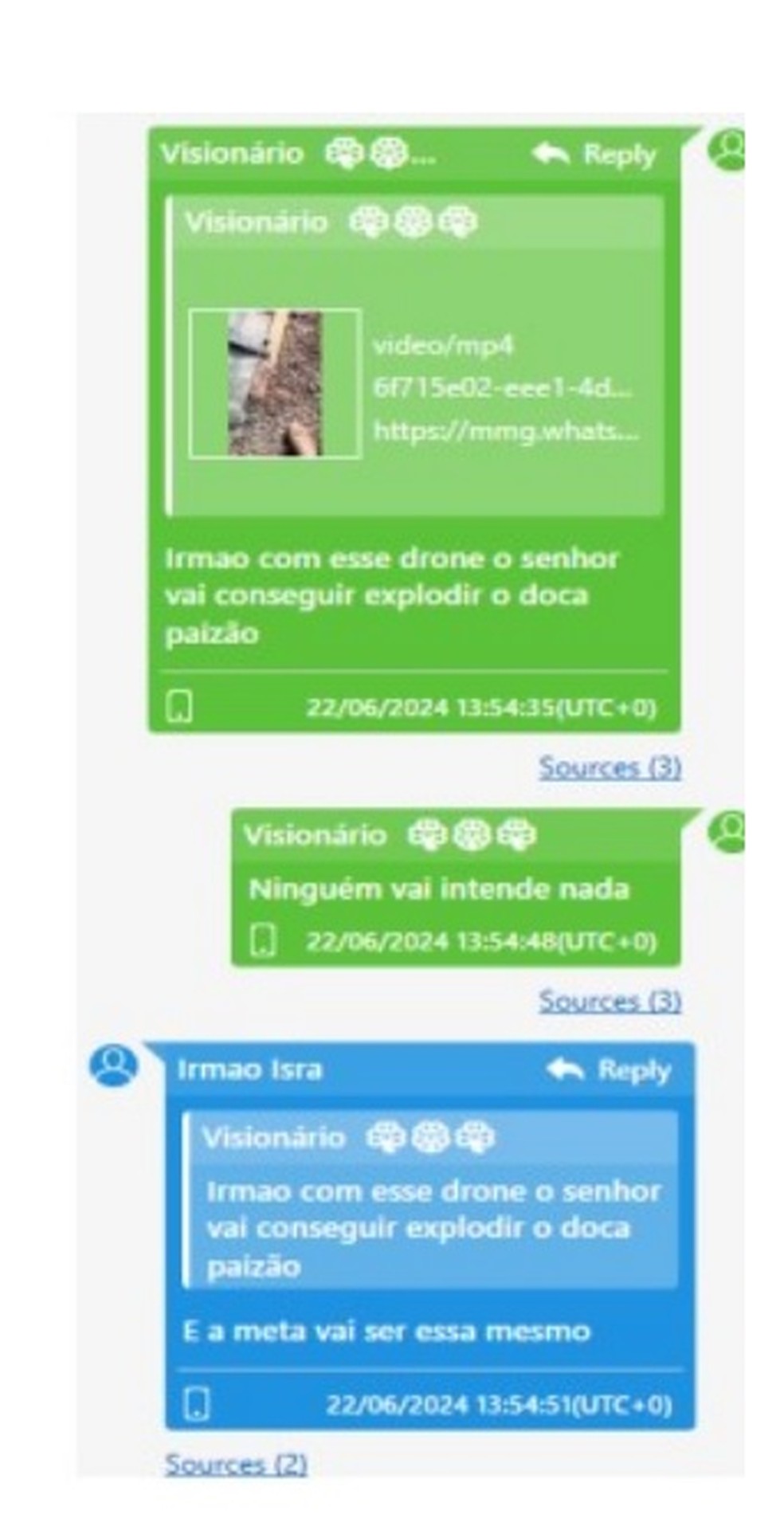 Em uma das conversas, Francesquet informa a Peixão que, com a aquisição de um drone capaz de lançar granadas, ele poderá eliminar “Doca”, apelido de Edgar Alves de Andrade, um dos chefes do CV. Na mensagem, Francesquet escreve: “Irmão, com esse drone, o senhor vai conseguir explodir o Doca, paizão. Ninguém vai entender nada”. Peixão responde em seguida: “E a meta vai ser essa mesmo”.