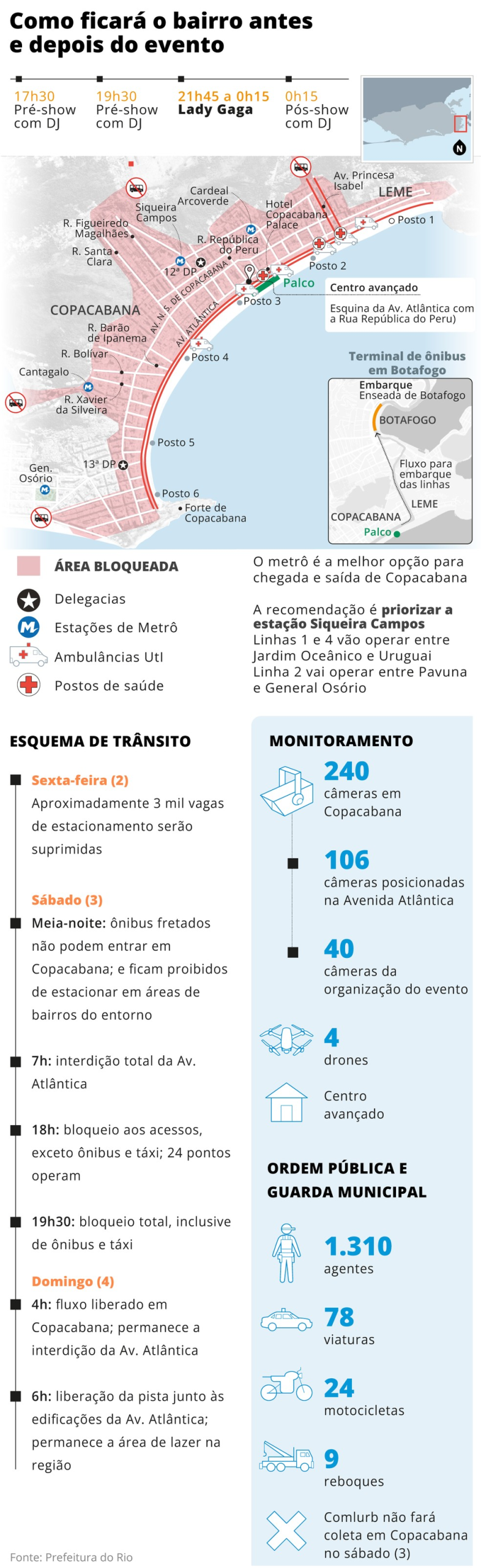 A cantora Lady Gaga se apresenta neste sábado em Copacabana, e autoridades divulgaram uma série de recomendações para garantir a segurança do público, especialmente de crianças e adolescentes. Na segunda-feira, por exemplo, a Polícia Militar destacou que aqueles que estiverem desacompanhados e sem identidade não poderão acessar a área do evento. Já a Secretaria Municipal de Assistência Social informou que haverá entrega de pulseiras de identificação nas estações do Metrô Cardeal Arcoverde e Siqueira Campos.