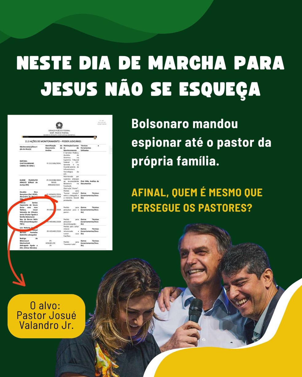 Em uma mensagem distribuída no grupo do curso Fé e Democracia para Evangélicos e Evangélicas, promovido pela Fundação Perseu Abramo — ligada ao PT —, Bolsonaro é acusado de ter espionado um pastor próximo à sua família. “Neste dia de Marcha Para Jesus, não se esqueça: Bolsonaro mandou espionar o pastor da própria família”, diz a imagem que acompanha uma fotografia do ex-presidente ao lado de Josué Valandro Júnior, líder da Igreja Batista Atitude, frequentada por Michelle Bolsonaro.