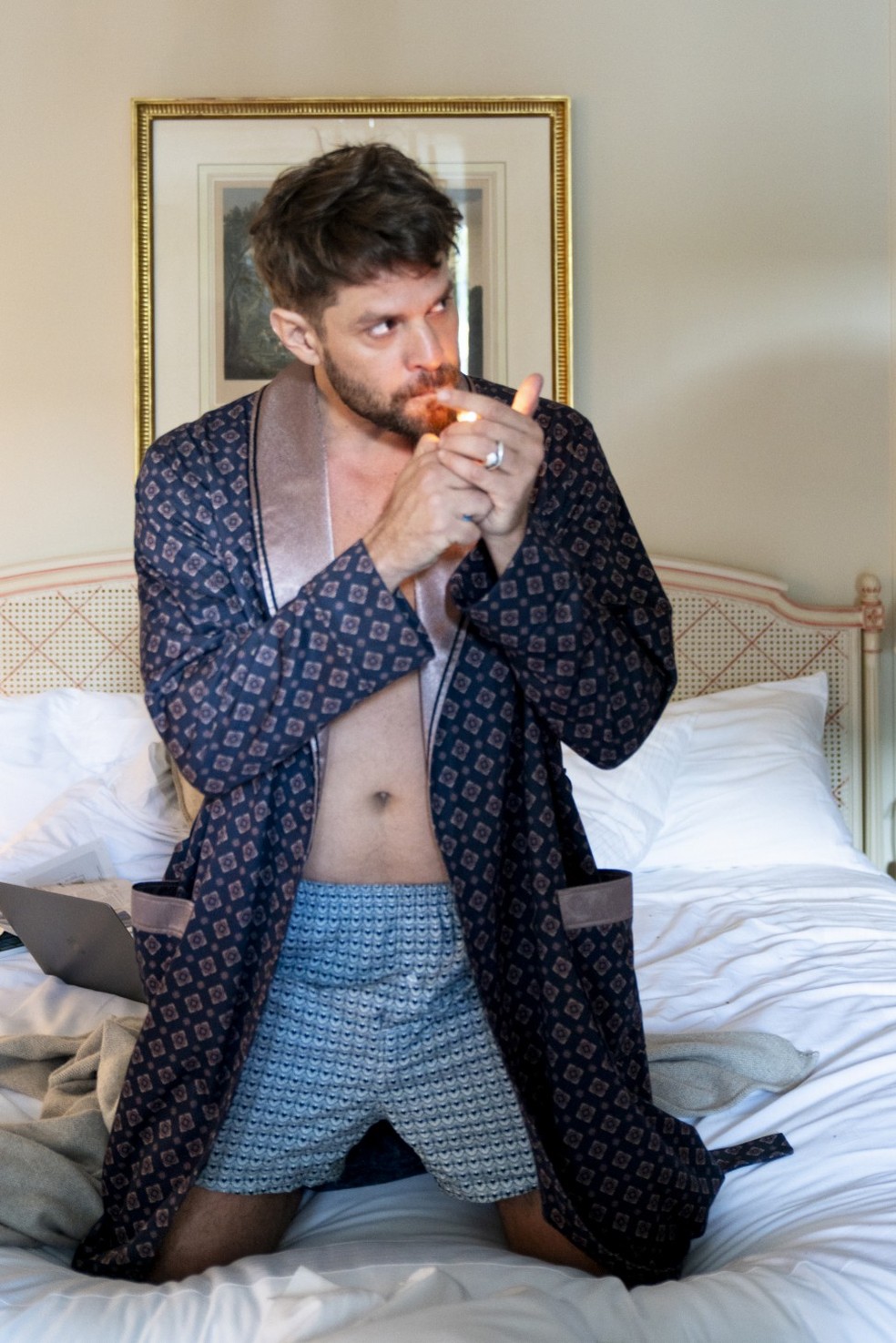 A timidez sai de cena quando a câmera entra em ação. Em Paris, durante a Semana de Moda, Alejandro Claveaux entregou-se aos cliques e ao charme de um dos melhores cenários da capital francesa, o Hotel Le Bristol, com um século de história. “Sou meio duro para fotos, mas estava entre amigos, com um figurino que adorei. Uma coisa meio clássica, mas também ousada. Sem medo”, explica, em entrevista por chamada de vídeo, o ator goiano, de 42 anos.