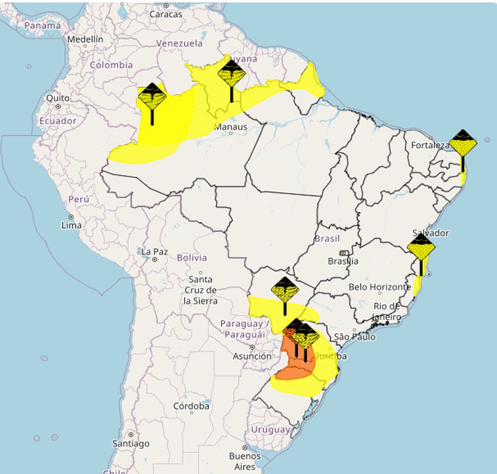 No Sul do país, Santa Catarina e Rio Grande do Sul permanecem com a sinalização laranja de “perigo” para tempestade e risco de queda de granizo. Apesar de mais branda, a chuva também permanece no Paraná, com pancadas de vento e trovoadas na cidade de Curitiba.