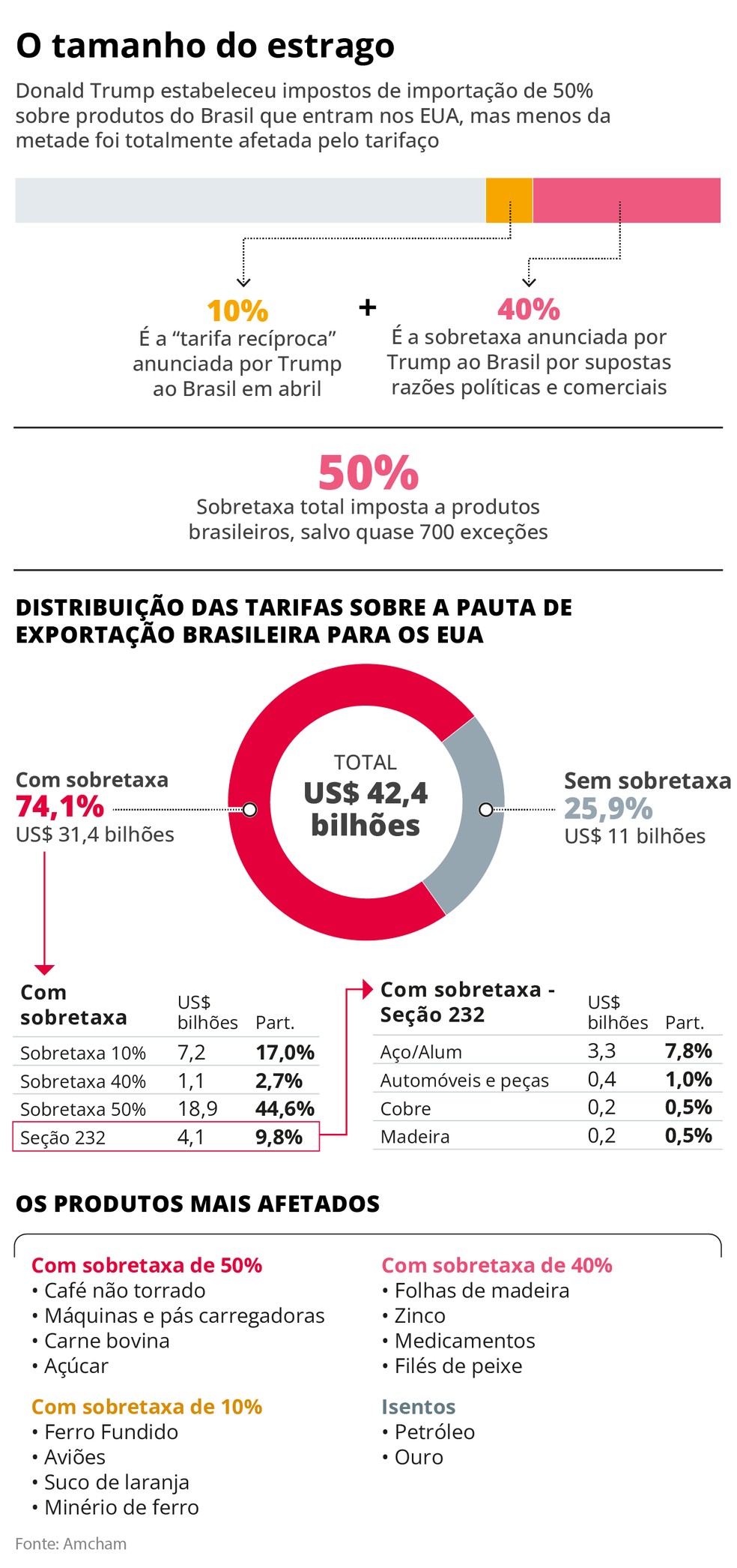 No xadrez tarifário de Trump, há espaço para produtos que foram impactados por tarifas setoriais específicas, previstas no âmbito da Seção 232 da Lei de Expansão do Comércio dos EUA, que permite a imposição de tarifas sobre bens considerados críticos para a segurança nacional. É nesta categoria que se encontram aço, alumínio e cobre, com percentual de 50%, e automóveis e autopeças, com taxa de 25%. Somados, os produtos atingidos por tarifas setoriais chegam a 9,8% da pauta.