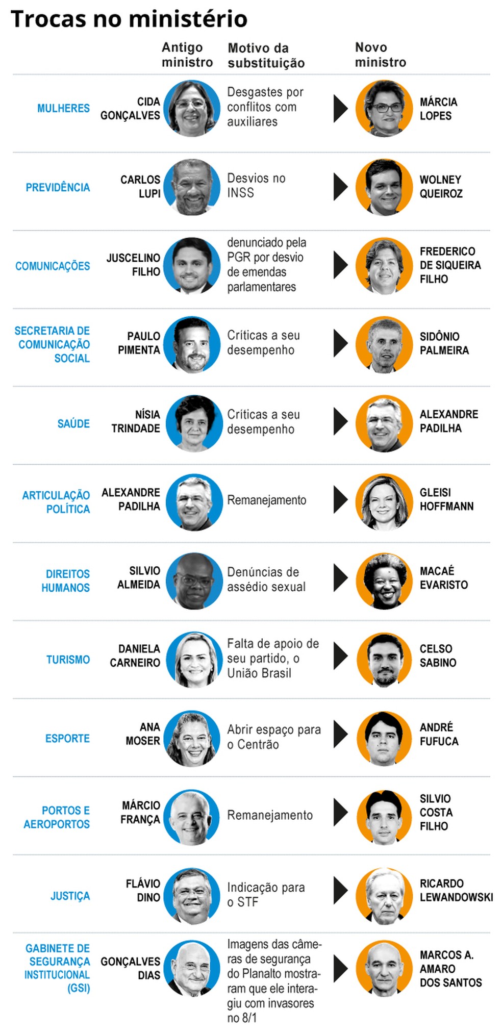 Desde o começo do ano, Lula fez mudanças na Secretaria de Comunicação Social (Secom), na Saúde, na Secretaria de Relações Institucionais (SRI), nas Comunicações e na Previdência. Na primeira pasta, o deputado Paulo Pimenta (PT-RS) deu lugar ao marqueteiro Sidônio Palmeira, em janeiro. Na Saúde, Nísia Trindade foi substituída em março por Alexandre Padilha, que estava na SRI, assumida por Gleisi Hoffmann.