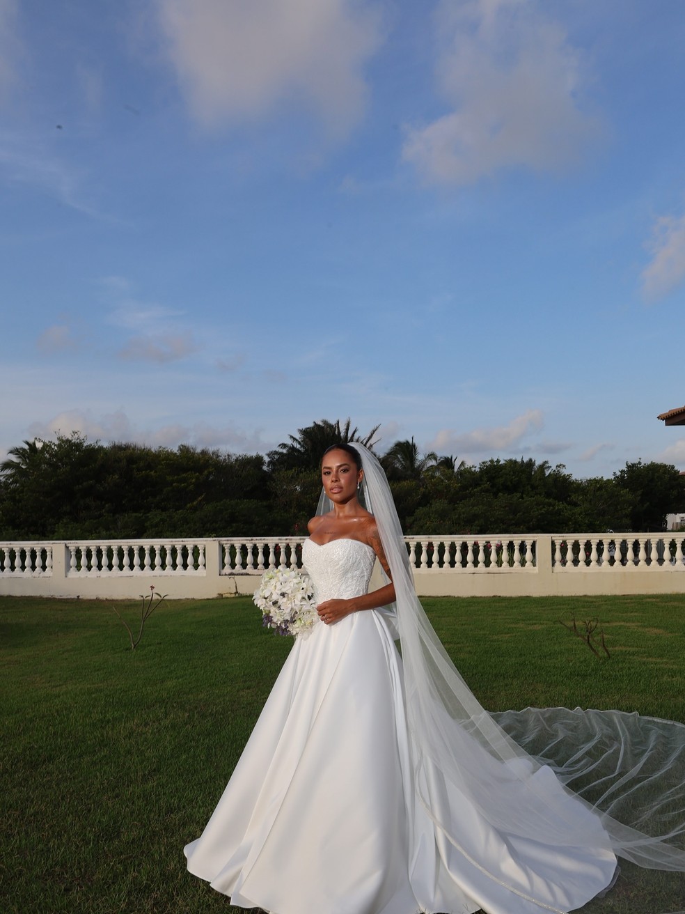 O vestido assinado pela grife brasileira Artemisi era um verdadeiro tributo ao estilo princesa, com tecido branco encorpado, decote quadrado, corpete estruturado e bordados delicados. O véu longo e o coque baixo completavam a produção atemporal.