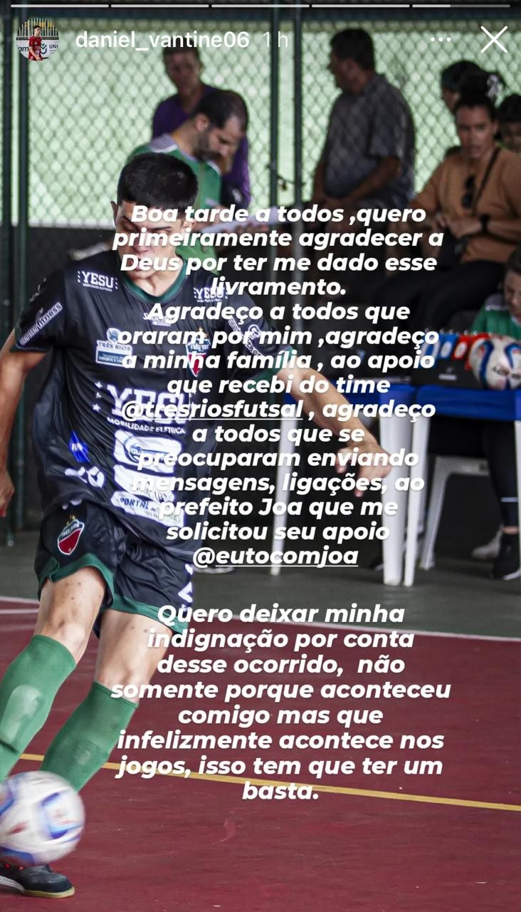 “Boa tarde a todos, quero primeiramente agradecer a Deus por ter me dado esse livramento. Quero deixar minha indignação por conta desse ocorrido, não somente porque aconteceu comigo mas que infelizmente acontece nos jogos, isso tem que ser um basta”, escreveu Daniel.