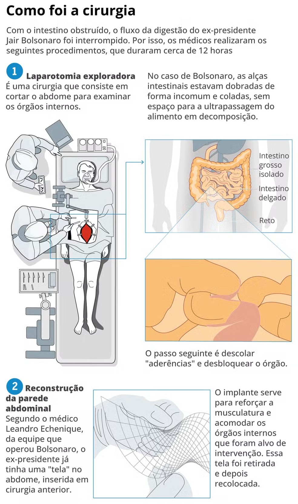 O procedimento, uma “laparotomia exploradora”, consiste em cortar o abdome para examinar os órgãos internos. No caso do ex-presidente, houve o diagnóstico de retenção do trânsito do intestino. O objetivo, então, foi desfazer as “aderências” que bloquearam a digestão do paciente. Depois, houve a reconstrução da parede abdominal, feita para reforçar a musculatura dessa parte do corpo.