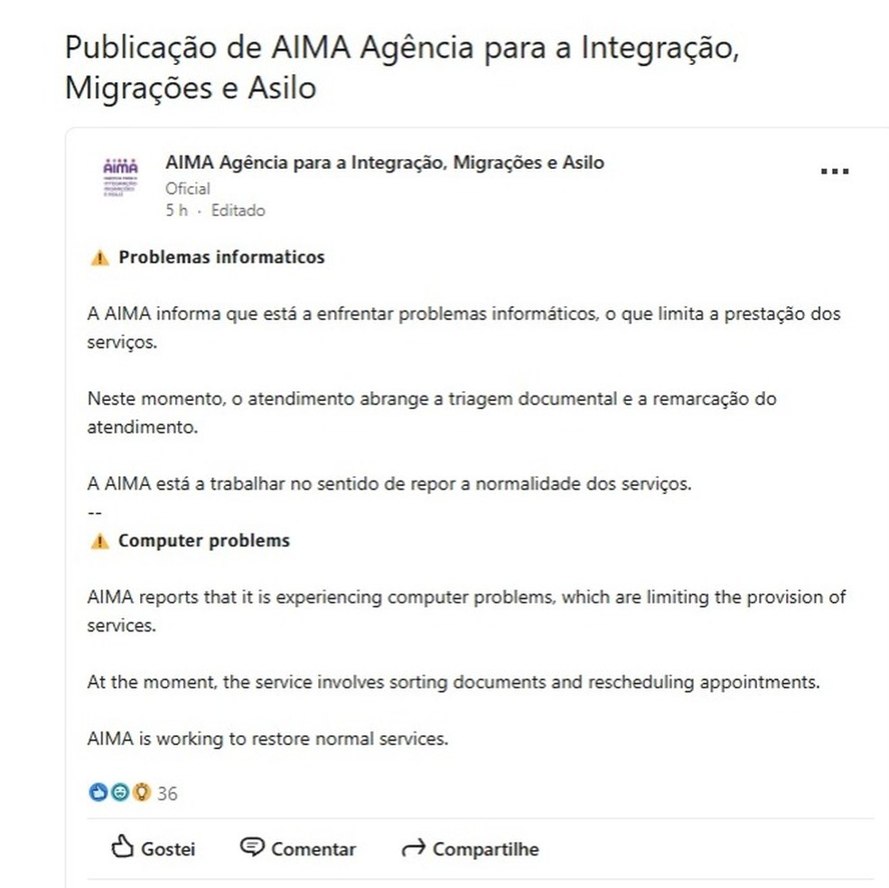 Logo pela manhã, a agência de imigração (AIMA) emitiu um comunicado informando que enfrentava problemas de informática e a limitação na prestação dos serviços.