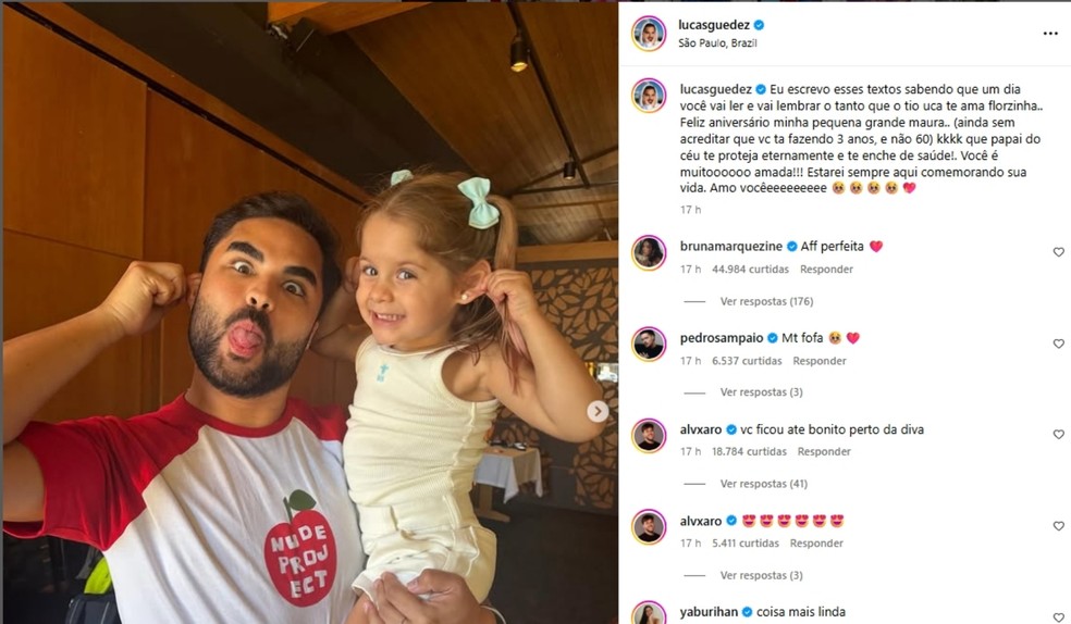 “Eu escrevo esses textos sabendo que um dia você vai ler e vai lembrar o tanto que o tio Uca te ama, florzinha. Feliz aniversário, minha pequena grande Maura… ainda sem acreditar que você tá fazendo 3 anos, e não 60 (risos). Que papai do céu te proteja eternamente e te encha de saúde! Você é muito amada! Estarei sempre aqui comemorando sua vida. Amo você”, escreveu.
