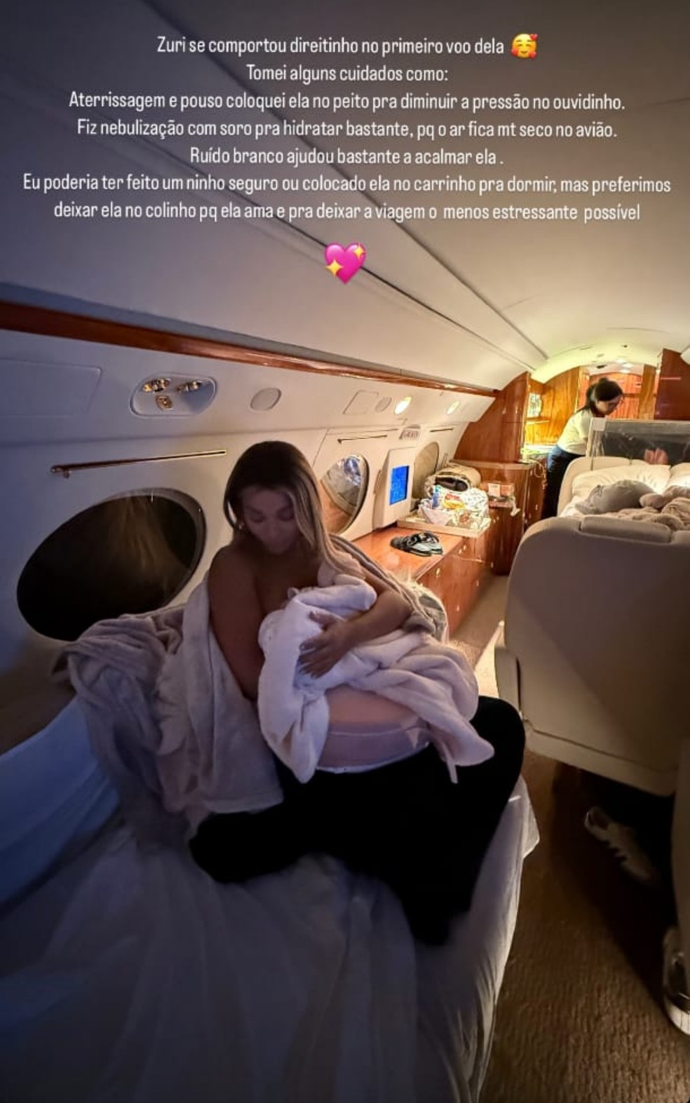 Brunna contou que, para minimizar o desconforto da pequena durante a decolagem e aterrissagem, amamentou a herdeira e usou nebulização com soro para hidratação, já que o ar dentro da aeronave costuma ser muito seco.