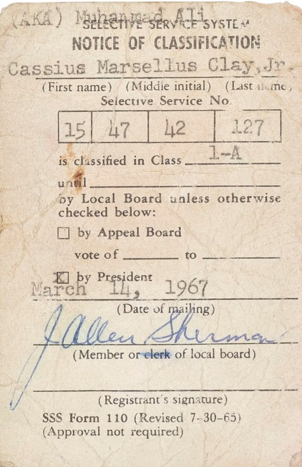 O cartão que agora vai a leilão traz o nome de nascimento do boxeador, Cassius Marcellus Clay Jr., grafado incorretamente como “Marsellus”. O documento foi assinado pelo presidente do conselho de recrutamento local de Louisville, cidade natal do atleta. Após sua conversão ao islamismo, Clay adotou o nome Muhammad Ali e passou a se posicionar publicamente contra o racismo e a guerra, tornando-se uma voz de destaque pelos direitos civis.