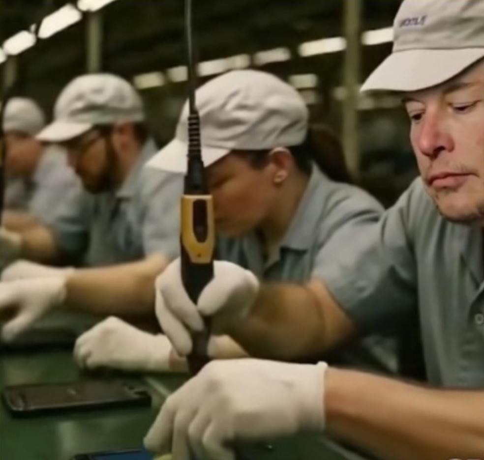 Donald Trump e Elon Musk na linha de produçäo de uma fábrica — Foto: Reprodução