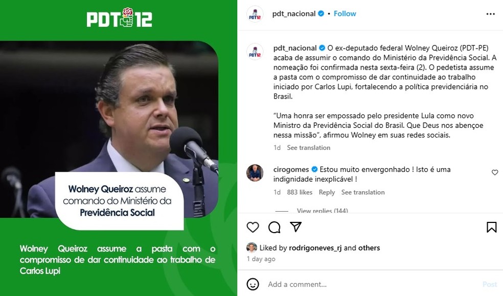 O ex-ministro Ciro Gomes, presidenciável do PDT nas eleições de 2018 e de 2022, manifestou incômodo com a substituição de Carlos Lupi pelo correligionário Wolney Queiroz (PDT-PE) no Ministério da Previdência. Em comentário nas redes sociais do próprio PDT, que havia anunciado a escolha de Wolney como novo ministro, Ciro se referiu à situação como “indignidade inexplicável”.