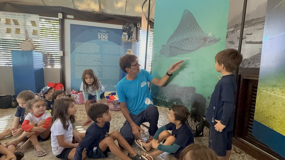 Diretor do Instituto Mar Urbano, Ricardo Gomes, em aula de biologia para crianças pequenas — Foto: Divulgação/Daniel Villela