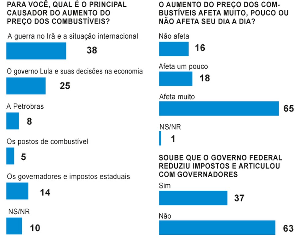 A Quaest perguntou aos eleitores: “Soube que o governo federal reduziu impostos e articulou com governadores?”. Entre os entrevistados, 63% disseram que não souberam e 37% souberam. No Nordeste, 70% desconheciam que houve redução de impostos sobre combustíveis. Entre as mulheres, 74%.