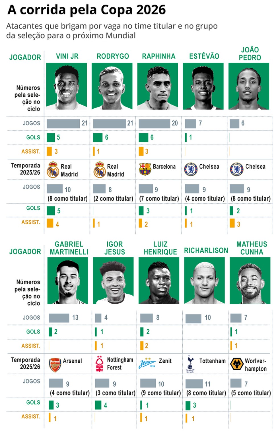 Até sua última convocação, Rodrygo era titular absoluto. Mas sua ausência foi aproveitada pelos concorrentes. Com a chegada de Carlo Ancelotti, Gabriel Martinelli cresceu pela esquerda e provou ser possível dividir espaço com Vini Jr. Pela direita, Estêvão tem correspondido a confiança, assim como Luiz Henrique mostrou que segue à vontade pela seleção mesmo após a ida para o futebol russo.