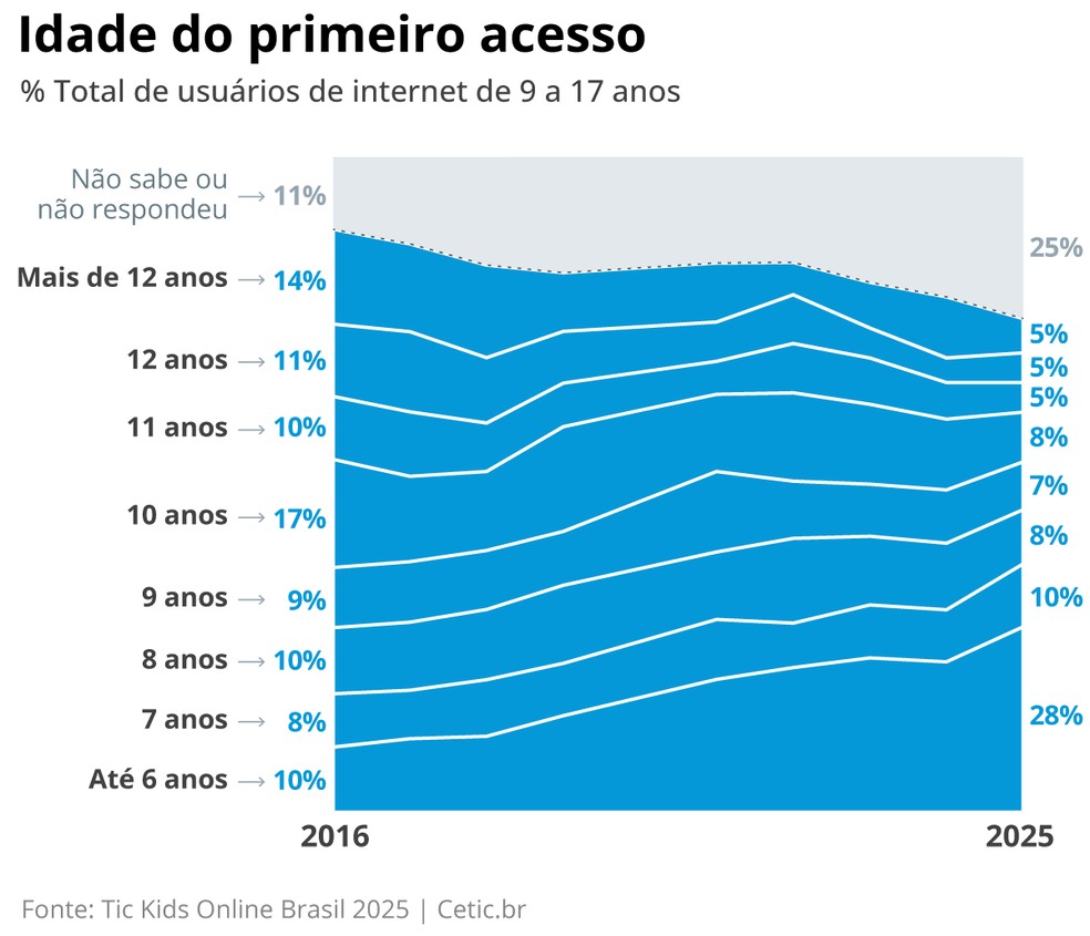 Em 2016, no início da série histórica, a pesquisa identificou que 10% dos usuários faziam o primeiro acesso à internet com até 6 anos. No novo levantamento, esse grupo chegou a 28% do total, o que aponta para uma inserção digital cada vez mais precoce.