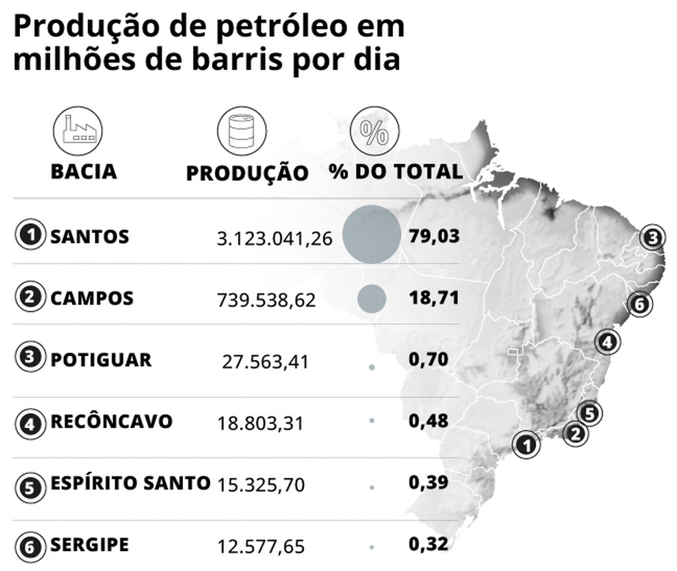 - Bacia de Santos: Principal fronteira de produção de petróleo do país com os campos de pré-sal. Além da Petrobras, petroleiras internacionais vêm ampliando a presença na região, como Shell, TotalEnergies, Equinor, Petronas, CNOOC, CNPC e Galp Energia.