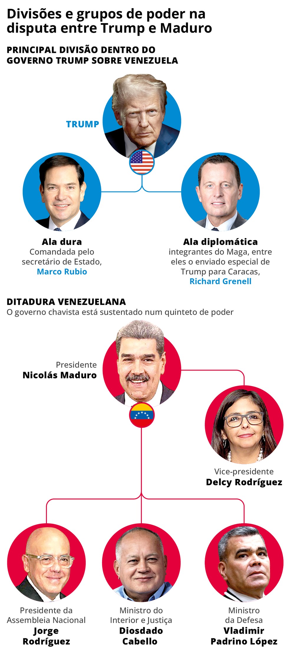 Diariamente, analistas políticos venezuelanos discutem em reuniões informais e grupos de WhatsApp possíveis cenários sobre um eventual conflito armado entre os Estados Unidos e seu país. Nesses debates, ninguém chega a conclusões sobre o objetivo do assédio militar americano à ditadura de Nicolás Maduro. A sensação que predomina, comentou ao GLOBO um importante analista local que participa dos debates, é a de que o presidente americano, Donald Trump, ainda não decidiu o que fazer com a Venezuela. E essa indecisão, acrescenta a fonte, estaria relacionada à divisão que existe dentro do governo americano sobre o tema. Nele convivem uma ala dura liderada pelo secretário de Estado americano, Marco Rubio, e uma ala considerada diplomática, comandada pelo enviado de Trump à Venezuela, Richard Grenell, integrante do Maga (sigla em inglês para o movimento de direita Faça os EUA Grandes Novamente).