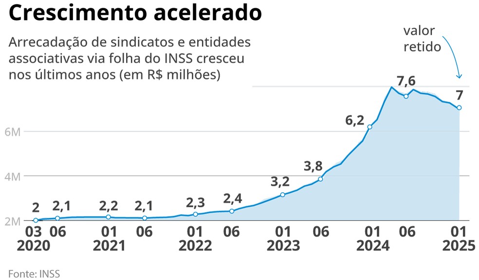 Em 2023, já havia ocorrido um aumento em relação ao ano anterior, com R$ 49,6 milhões em descontos. O INSS só possui dados de março de 2020 para cá. Naquele ano, foram R$ 21,2 milhões em descontos sindicais, e em 2021 foram R$ 25,8 milhões.