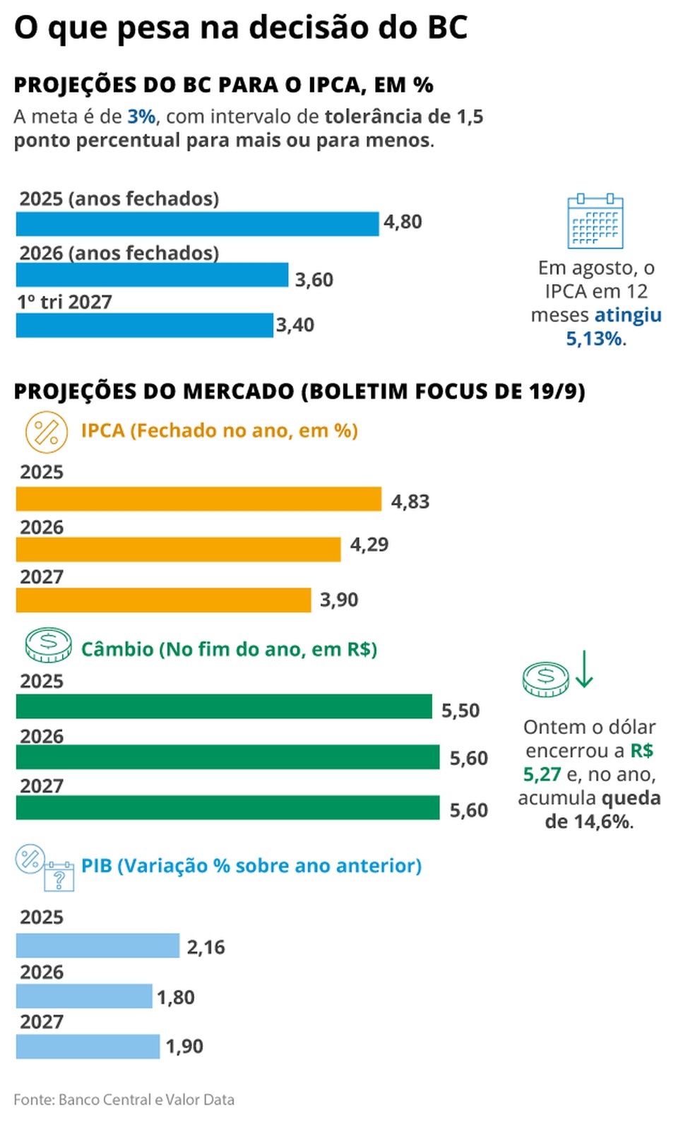 A inflação é a principal preocupação do BC, apesar dos sinais de freio recentes. A projeção atual é que o IPCA recue a 3,4% no primeiro trimestre de 2027, período que o Copom mira para levar a inflação à meta de 3%.