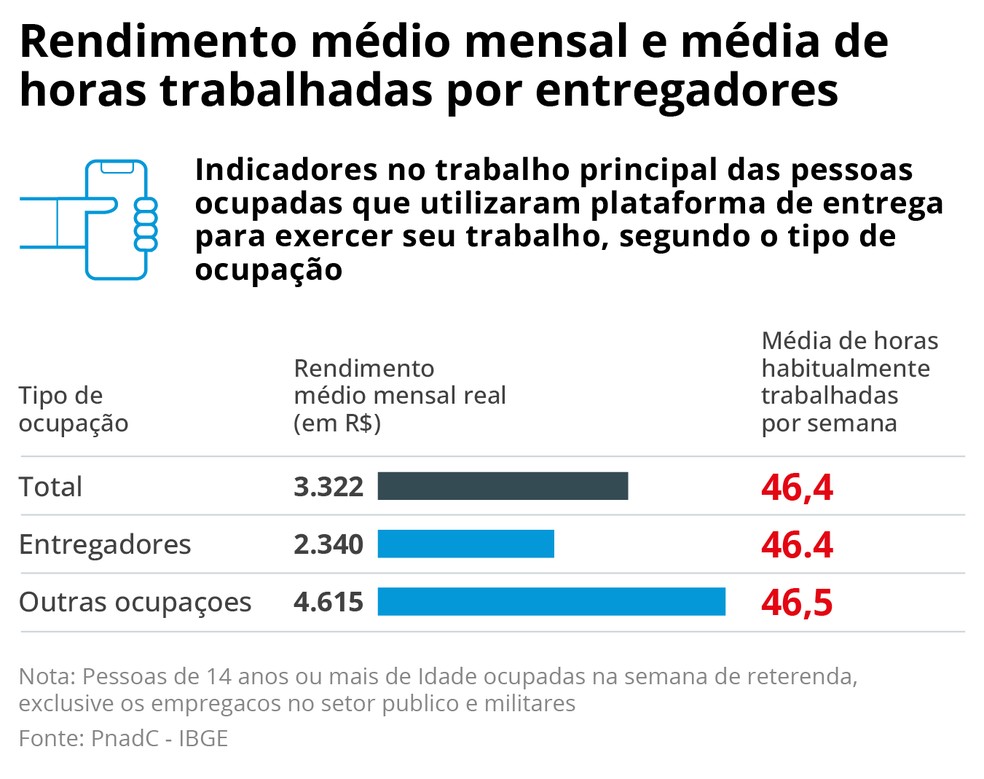 Os entregadores, além de terem escolaridade menor que os demais que também trabalham com aplicativo de entrega, são os que têm o menor rendimento. A carga horária semanal, no entanto, é equivalente (46,4 horas para os entregadores e 46,5 horas para as outras ocupações que usam app de entrega).