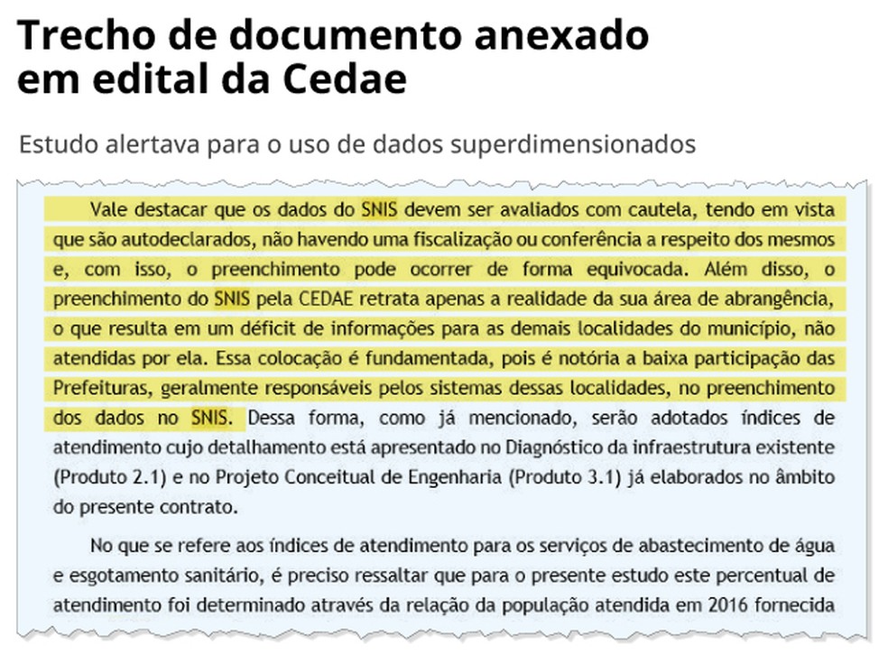 “Vale destacar que os dados do Snis devem ser avaliados com cautela, tendo em vista que são autodeclarados, não havendo uma fiscalização ou conferência a respeito dos mesmos e, com isso, o preenchimento pode ocorrer de forma equivocada. Além disso, o preenchimento do Snis pela Cedae retrata apenas a realidade da sua área de abrangência, o que resulta em um déficit de informações para as demais localidades do município, não atendidas por ela. Essa colocação é fundamentada, pois é notória a baixa participação das prefeituras, geralmente responsáveis pelos sistemas dessas localidades, no preenchimento dos dados no SNIS” — diz o relatório.