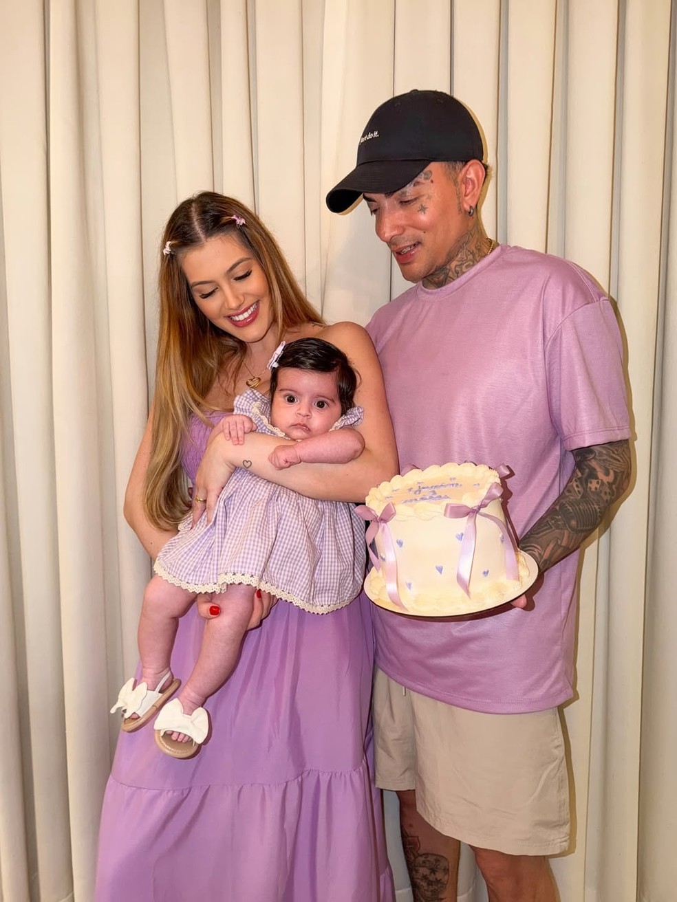 A celebração foi organizada de forma intimista e reuniu apenas familiares próximos. Nas imagens publicadas pelo artista, o casal aparece posando com a herdeira diante de uma cortina clara que serviu de pano de fundo para o momento. Fernanda escolheu um vestido longo em tom lilás, enquanto Guimê apostou em uma combinação casual com camiseta na mesma paleta, bermuda clara e boné preto, criando um visual coordenado com a estética delicada da comemoração.