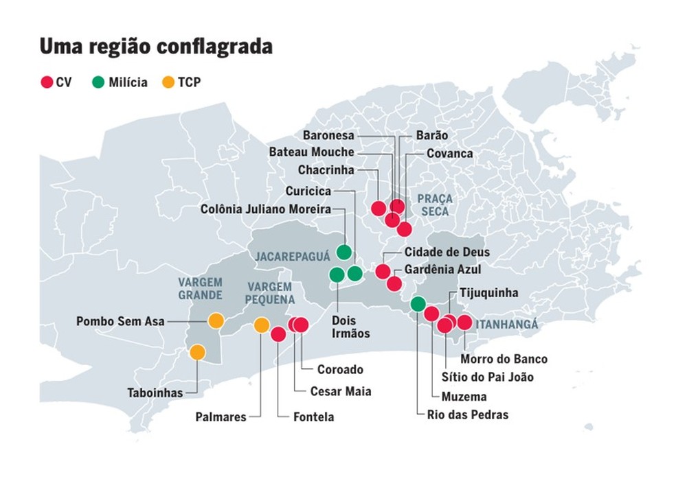 Nos últimos dois anos, o Comando Vermelho tomou a tiros pelo menos dez comunidades na nova Zona Sudoeste, numa estratégia de criar um cinturão ligando o Recreio dos Bandeirantes ao Maciço da Tijuca, no Itanhangá. Para resistir, favelas dominadas por milícias e TCP estão investindo em reforçar seus territórios com homens e armas.