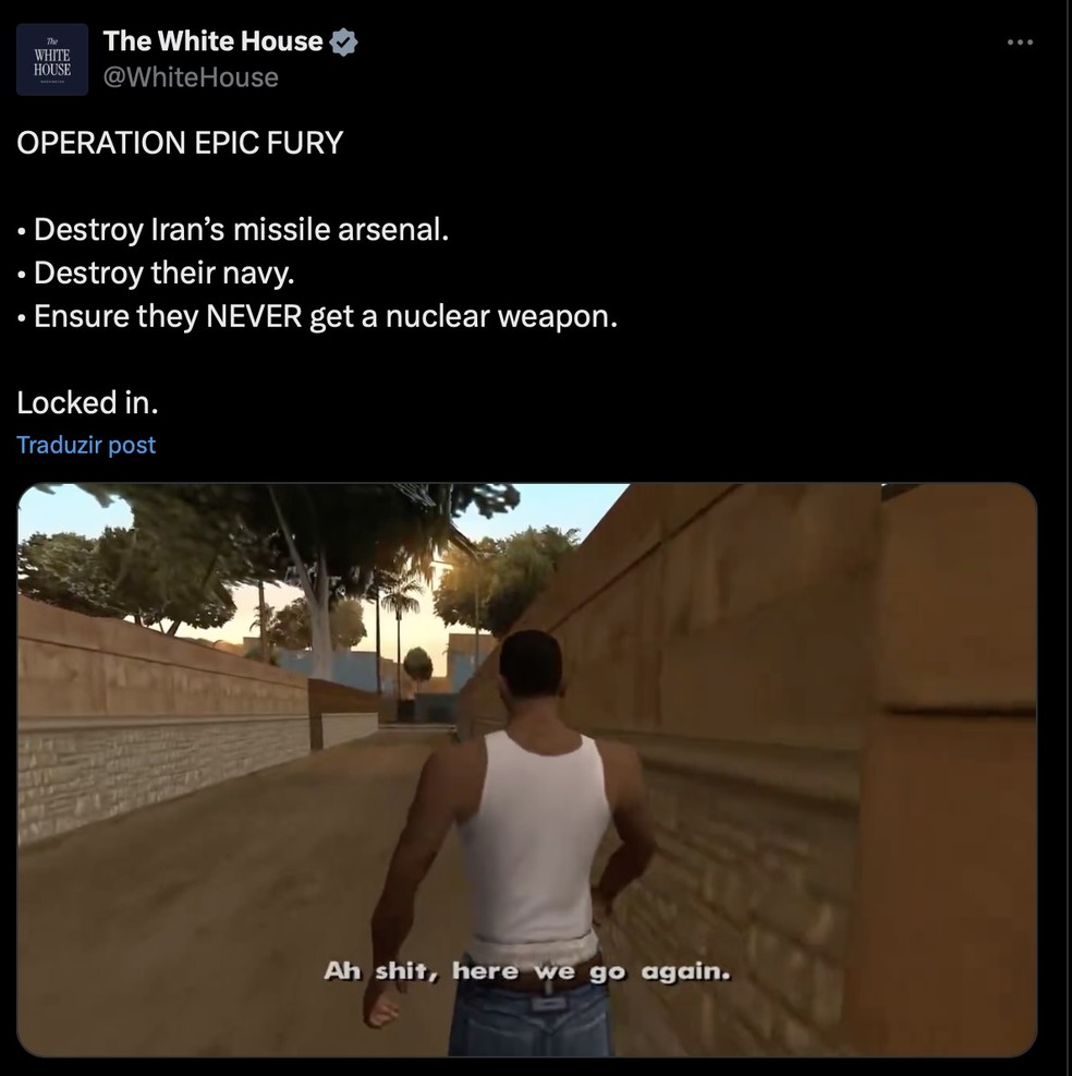 Mas os vídeos da Casa Branca sobre o Irã não defendem ideais além da dominação e do poder. Há pouco sentido nessas imagens em relação ao propósito da guerra, além de vencê-la. A mensagem pode ser resumida no refrão da música “Bazooka”, da banda Miami XO, que se tornou um meme e foi usada em um dos vídeos: “Ka-blow/Ka-boom”, onomatopeia usada para “sonorizar” explosões no território iraniano.