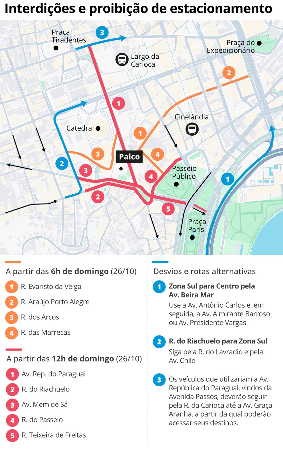 - veículos que utilizariam a Avenida República do Paraguai, vindos da Avenida Passos, deverão seguir pela Rua da Carioca até a Avenida Graça Aranha, a partir da qual poderão acessar seus destinos