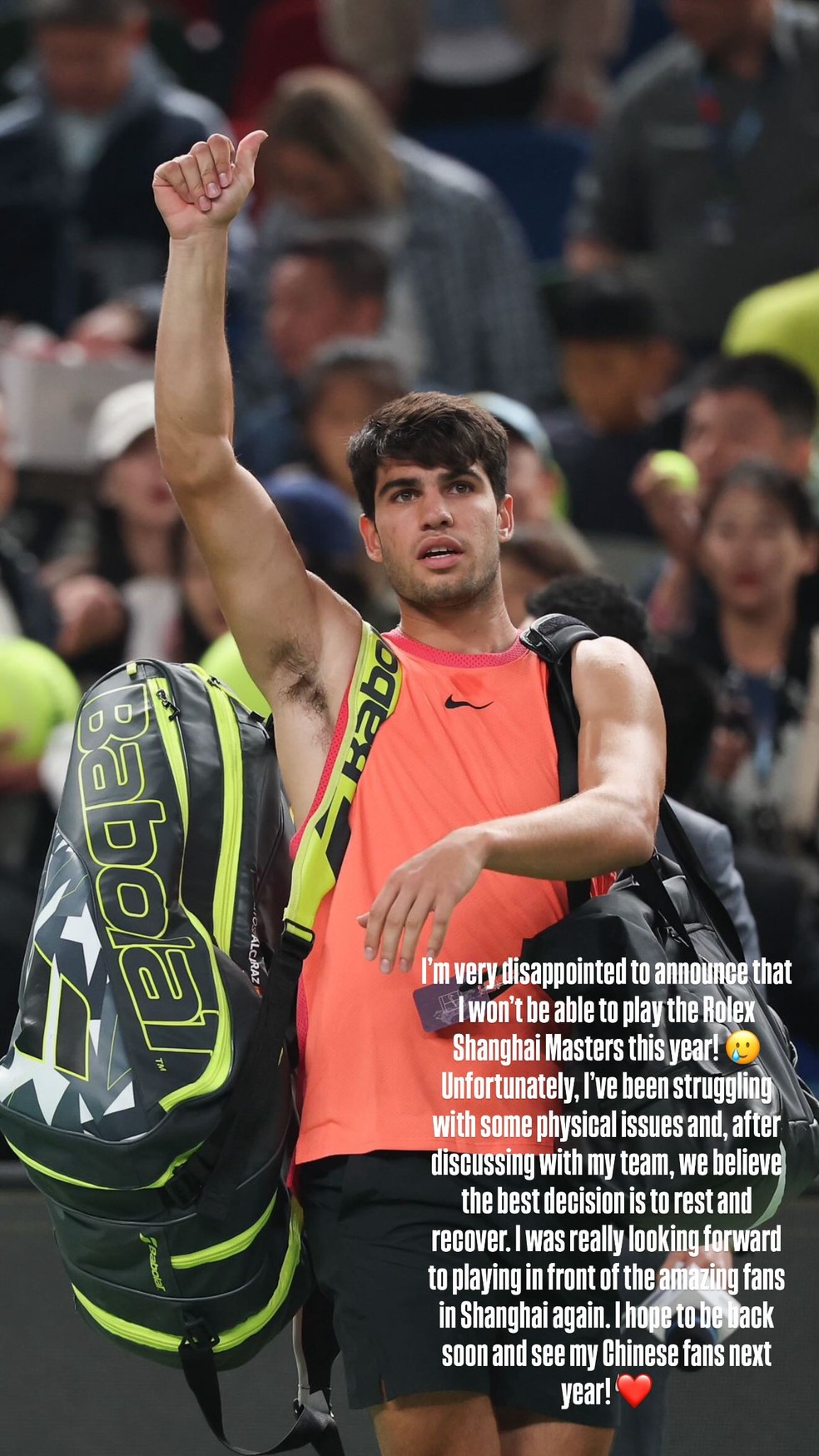 “Estou muito desapontado em anunciar que não poderei jogar o Masters de Xangai este ano”, escreveu o espanhol de 22 anos, em um story, em sua conta do Instagram. “Infelizmente, estou superando alguns problemas físicos e depois de discutir com minha equipe, acreditamos que a melhor decisão é descansar e recuperar”, acrescentou Alcaraz.