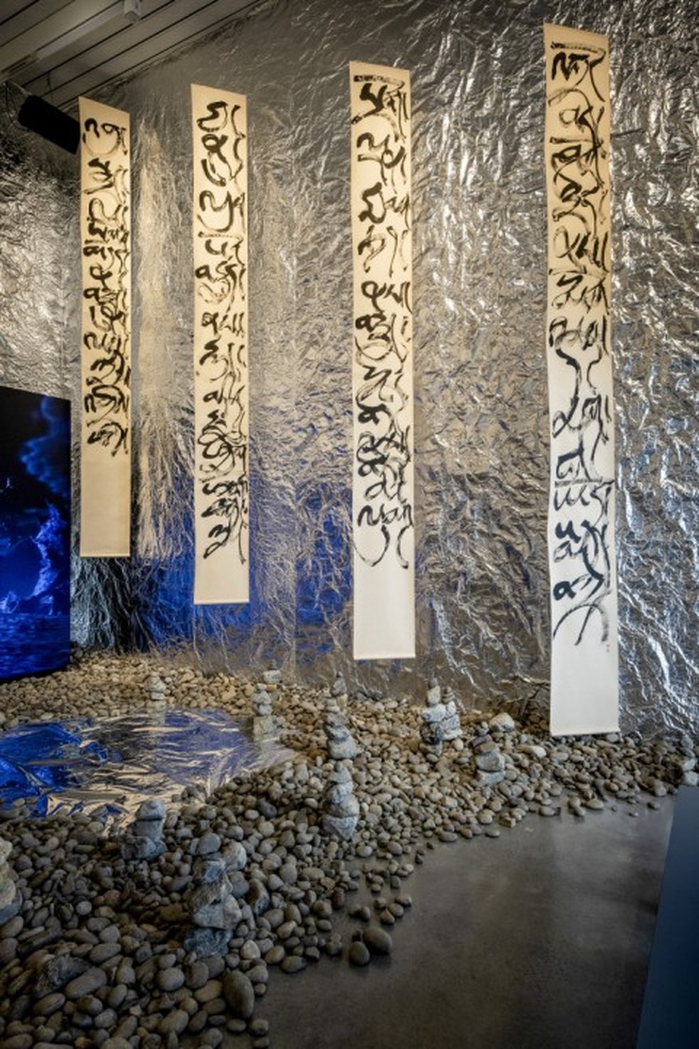 A segunda solução vem na forma oposta: a religião tradicional. Na exposição do Amant, pilhas de pedras ladeiam o pátio, evocando os marcos devocionais mani do budismo tibetano, dispostos ao longo de trilhas nas montanhas. Rolos de oração também estão pendurados, com inscrições curtas atribuídas ao budista tibetano Dzogchen Pema Tashi Rinpoche. “Que eu me torne um refúgio e guia para todos os seres sencientes”, diz um deles. “Um curandeiro e remédio para os doentes, um apoio e uma balsa para aqueles sem refúgio”, diz outro.