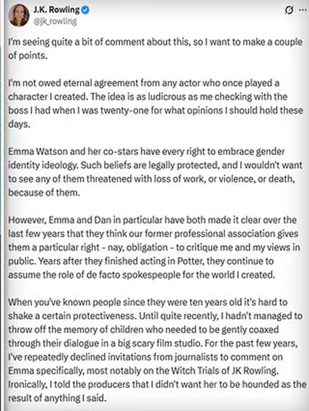 Rowling disse que Emma Watson e Daniel Radcliffe, em particular, têm se colocado como “porta-vozes de fato” do universo Harry Potter, ao criticarem publicamente suas opiniões. A autora também recordou um episódio em que, após um discurso feminista da atriz, recebeu um bilhete escrito à mão com a mensagem: “Sinto muito pelo que você está passando”. Segundo Rowling, o gesto foi contraditório diante das críticas públicas.