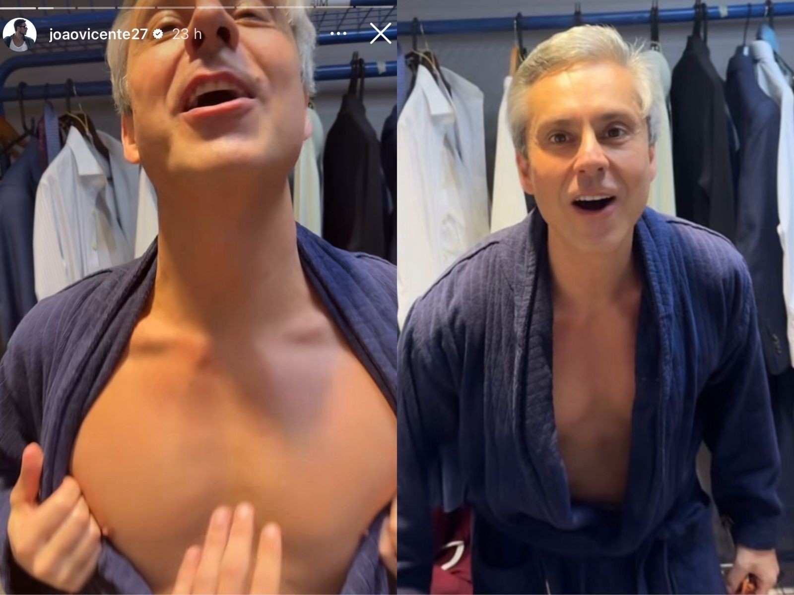 João Vicente de Castro registrou em suas redes sociais um momento descontraído entre ele e Alexandre Nero. Os dois contracenam em “Vale tudo”, interpretando os primos Renato e Marco Aurélio. João Vicente flagrou o colega de roupão nos bastidores das gravações da novela e elogiou seu físico: