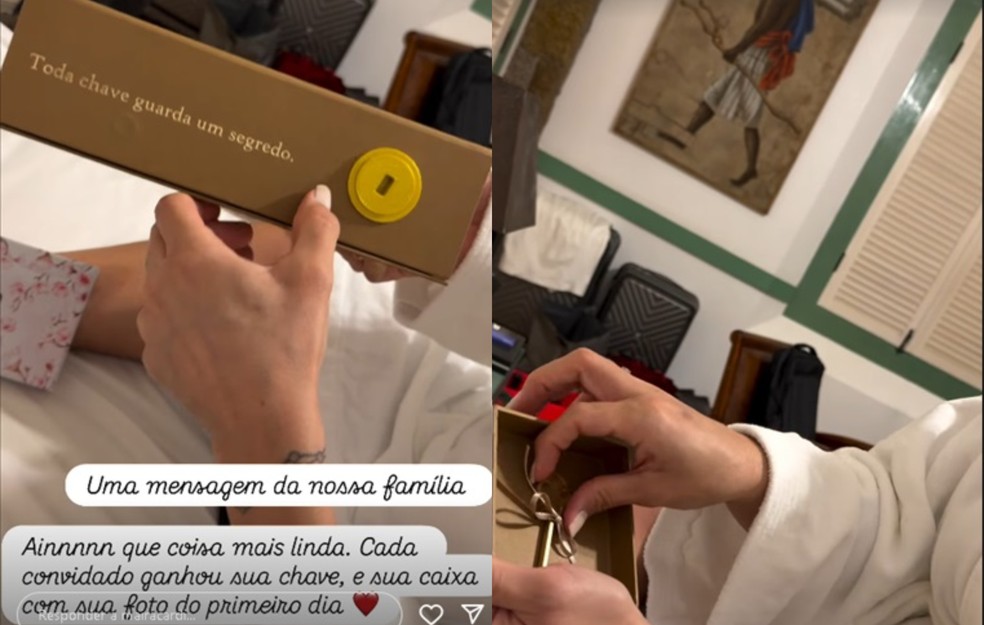 “Agora que os casais chegaram no quarto, eles receberam essa caixa, que está escrito: ‘Toda chave guarda um segredo’. No primeiro dia, [eles receberam] essa [outra] caixa, que já tinha mostrado para vocês e tem uma chave dentro. As pessoas não tinham entendido o que era essa chave. Agora, é só tirar a chave [da caixa] e descobrir o segredo”, explicou Maíra.