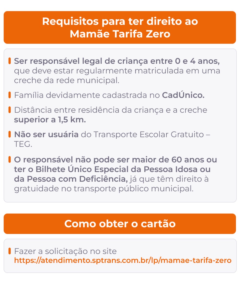 Para enfrentar esse obstáculo, a cidade de São Paulo passou a oferecer o Mamãe Tarifa Zero, programa da Prefeitura que garante transporte público gratuito a responsáveis por crianças de 0 a 4 anos matriculadas em creches da rede municipal, desde que a unidade esteja localizada a mais de 1,5 quilômetro da residência da família. É necessário que os beneficiários estejam inscritos no Cadastro Único (CadÚnico).