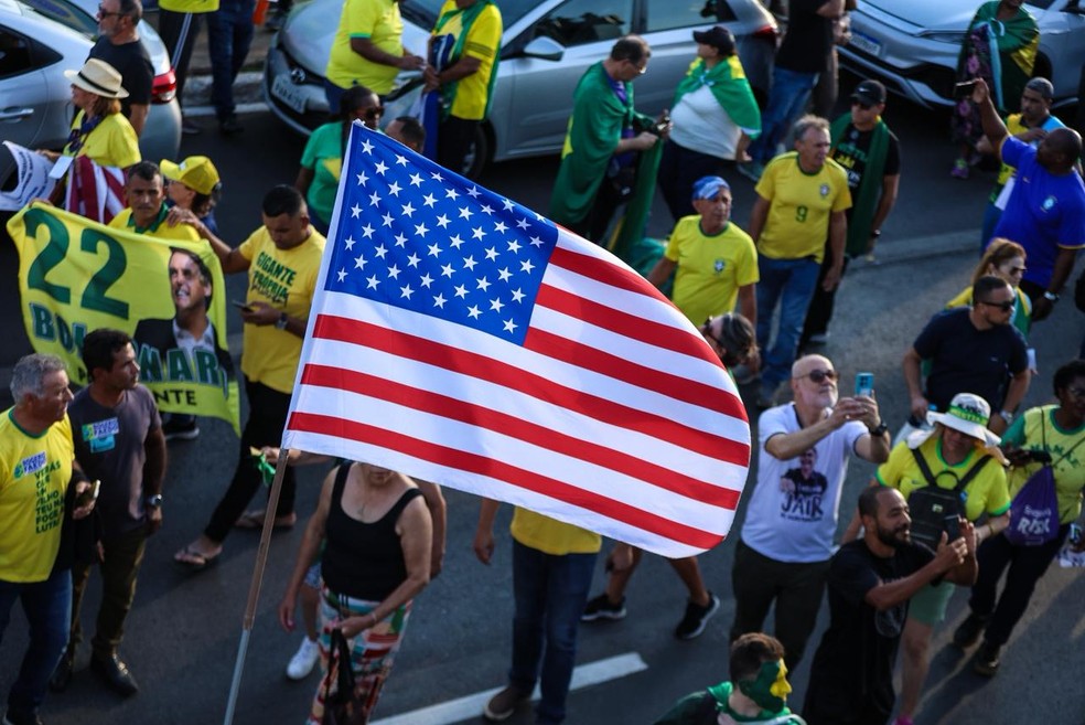 Bandeiras dos Estados Unidos e declarações de amor ao presidente americano, Donald Trump, puderam ser vistos.
