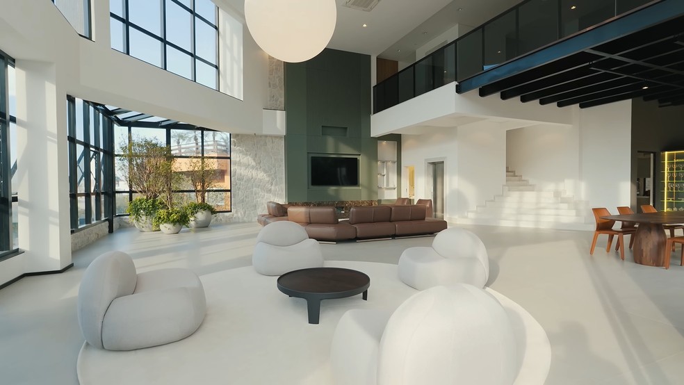Entre os diferenciais que reforçam a exclusividade do imóvel estão o sofá Natuzzi avaliado em mais de R$ 200 mil, piscina privativa com cromoterapia, adega climatizada para mais de 500 rótulos, além de revestimentos em pedra natural e madeira de alta durabilidade.