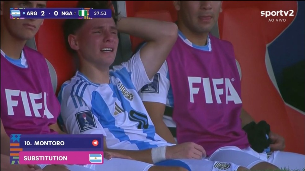 Montoro deixou o gramado chorando após sofrer lesão no ombro durante partida pela seleção argentina — Foto: Reprodução