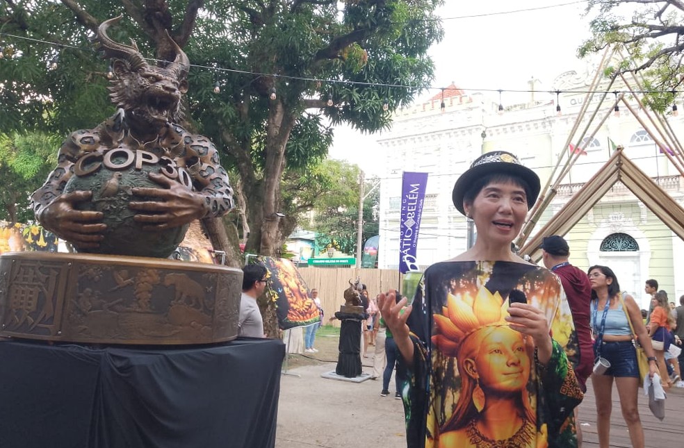 Embaixadora de arte olímpica do Comitê Olímpico Internacional (COI), Jian também criou outra peça para a COP30, a “Mãe Brasil”, que retrata uma mulher sobre uma vitória-régia. O material integra o conjunto de legados culturais deixados pela conferência em Belém e fica na Praça da Bandeira, área da Freezone Cultural Action.