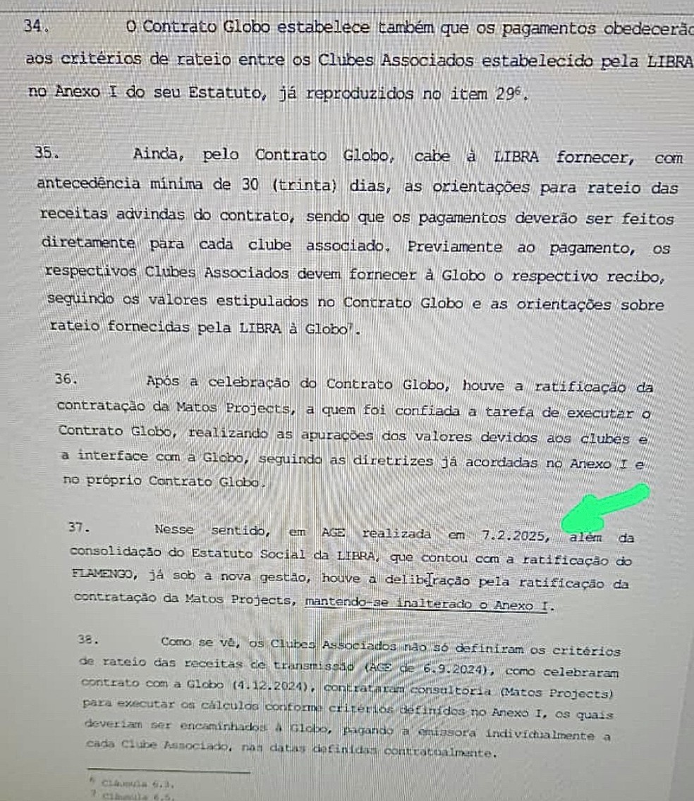 “Nesse sentido, em AGE realizada em 7.2.2025, além da consolidação do Estatuto Social da Libra, que contou com a ratificação do Flamengo, já sob a nova gestão, houve a deliberação pela ratificação da contratação da Mattos Projects, mantendo-se inalterado o Anexo 1”, diz trecho da petição.