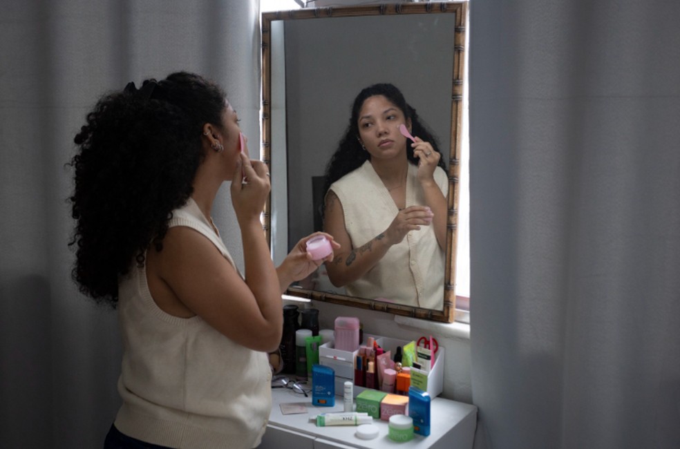 Daniela Ferreira testa produtos de skincare coreanos, que ganham popularidade no Brasil — Foto: Domingos Peixoto / Agência O Globo