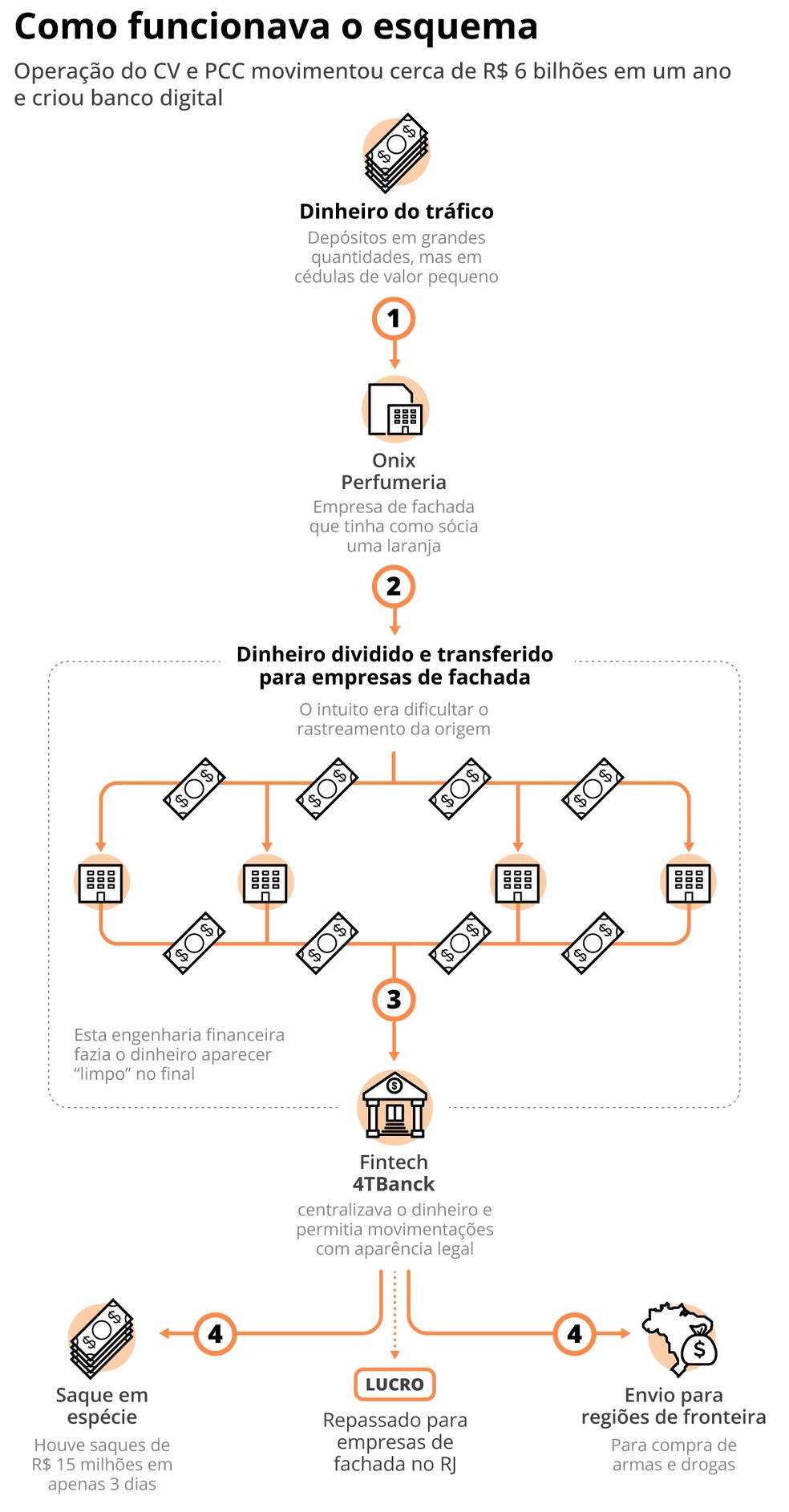 Segundo a polícia, parte dos recursos bilionários concentrados nesse banco digital era enviada para instituições financeiras localizadas em regiões de fronteira, em países reconhecidos como fornecedores de drogas ao Brasil — valores que seriam usados para a compra de entorpecentes e armamentos. A outra parte retornava como lucro para a facção, repassada a empresas de fachada estabelecidas no estado do Rio de Janeiro.