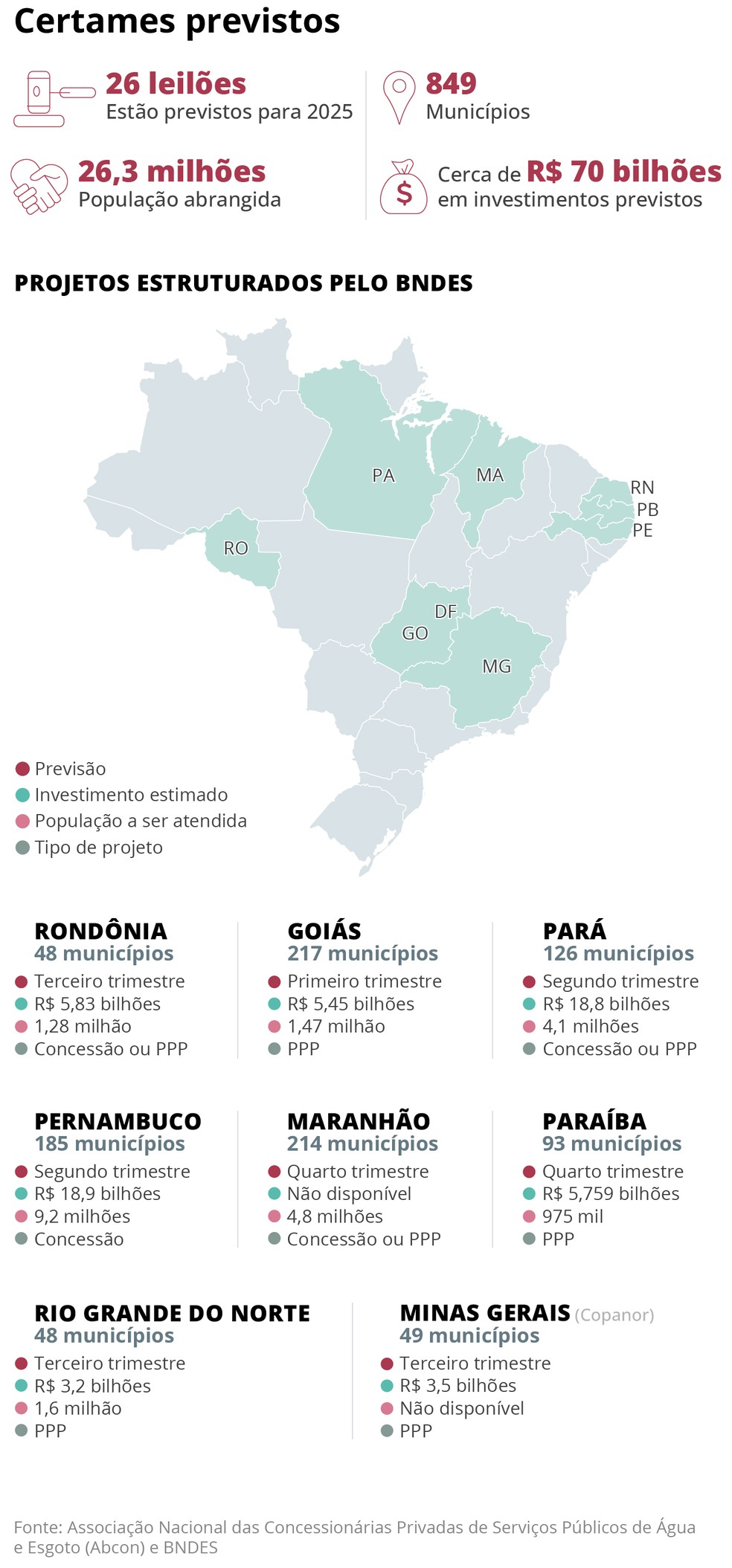 O saneamento básico deve atrair R$ 70 bilhões em investimentos com a nova rodada de 26 leilões prevista para este ano, abrangendo principalmente as regiões Norte e Nordeste, áreas historicamente carentes de acesso à água tratada e rede de esgoto. Segundo a Associação Nacional das Concessionárias Privadas de Serviços Públicos de Água e Esgoto (Abcon), 26,3 milhões de pessoas devem ser beneficiadas em 849 cidades.