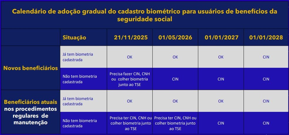• 1º de maio de 2026: Para quem já tem biometria cadastrada em alguma base, nada muda e esse cadastro continua válido para novos pedidos e renovação. Quem não tem biometria cadastrada e for pedir um novo benefício, precisará ter a CIN a partir dessa data.