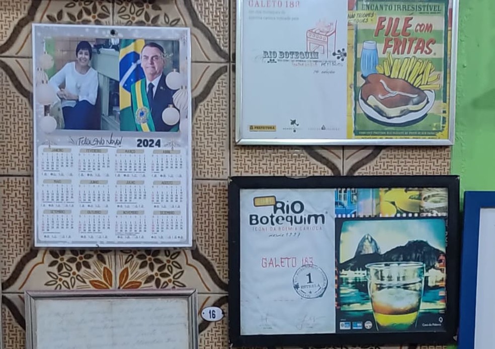 No salão, fotos simpáticas de fregueses dividem espaço com imagens de político fazendo “arminha”, adesivos de “que saudade do meu ex” e uma bandeira do Brasil esticada desde o dia em que Lula foi preso. Até pouco tempo, o cliente pagava a conta no balcão sob o olhar atento da dona e de um pequeno busto de Jair Bolsonaro. Na parede, pendurado ao lado dos prêmios que o restaurante já recebeu, um calendário de 2024 é ilustrado com a foto oficial do ex-presidente e de uma sorridente imagem de Dona Ana.