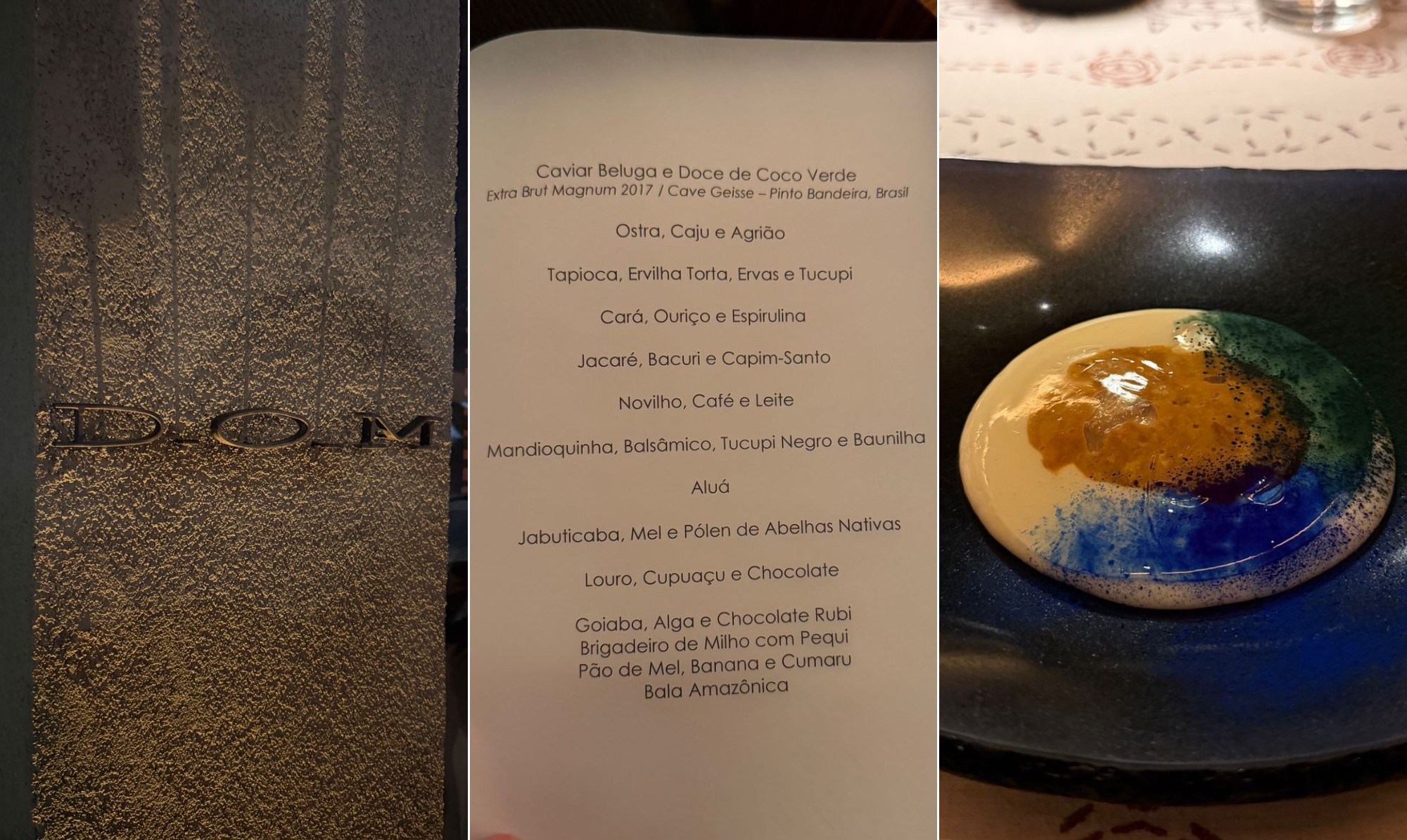 O novo menu do D.O.M., cujo tema é “Quando a onça bebe água”, tem título curioso e, em algum grau, instiga a curiosidade do cliente. O problema é a explicação do serviço: “é um menu que remete à água e aos biomas por onde a onça passa”. Ponto. É simples assim. Em nenhum outro momento essa introdução é amarrada ou especificada. Quando os pratos chegam, a gente joga nas mãos de Deus a dedução sobre o que caviar, coco, mandioca e ovas de ouriço têm a ver com onça e água. Ficar contando historinha de bioma já irrita de antemão. Mas, se você escolheu contar, que pelo menos conte direito.