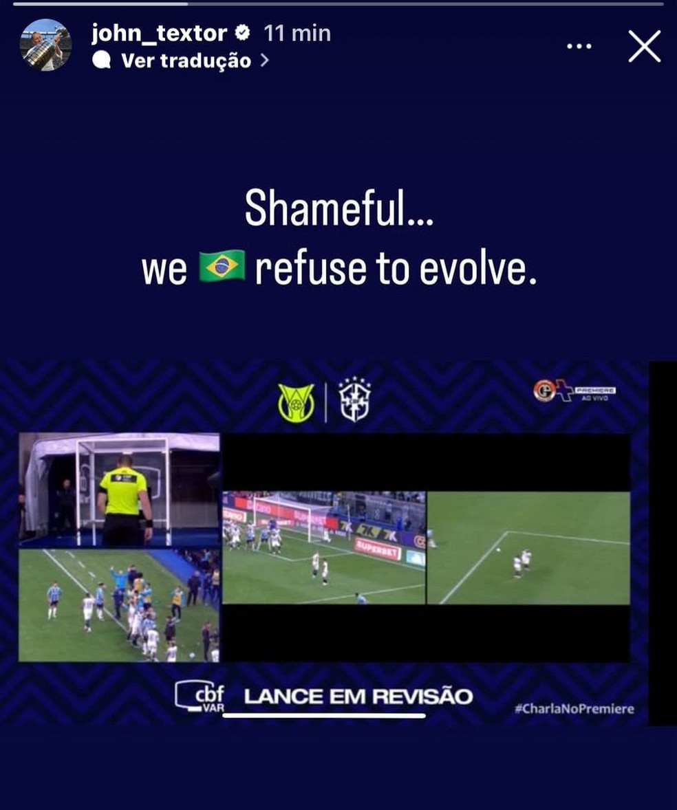 Antes, John Textor, dono da SAF do Botafogo, foi às redes sociais para criticar o pênalti marcado contra o alvinegro, aos 44 minutos do 2º tempo, que acabou por decretar o empate em 1 a 1 com o Grêmio em Porto Alegre.