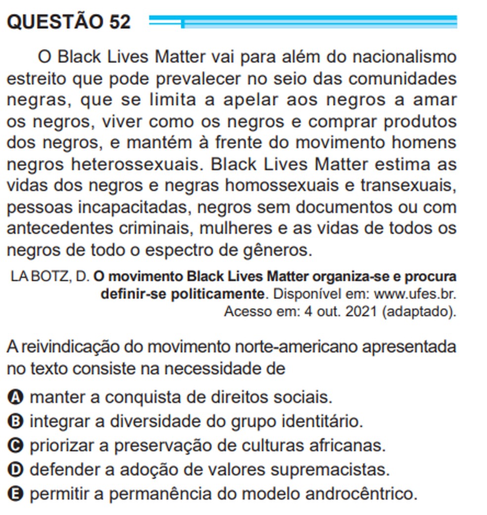 Questões que envolvem cultura, identidade e causas identitárias também são bastante frequentes no Enem. Uma possibilidade é a da relação afetiva dos grupos humanos com o espaço, que dialoga com o conceito de lugar, da Geografia. Além disso, destaca a professora, o tema identitário muitas vezes conversa com os movimentos sociais. Um exemplo é a questão da prova de 2024 sobre o Black Lives Matter, que buscava saber como esse movimento reforçava a identidade.